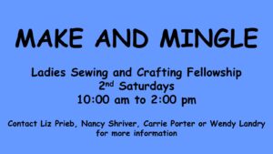 Ladies Make and MingleThis is a time of fellowship and fun as you work on your personal quilting, knitting or craft projects with a group of other women. Meets the 2nd Saturday of each month from 10:00 am to 2:00 pm. Bring a lunch or snacks and come and go as you please. Tables, ironing boards and power strips will be available. Invite your friends!